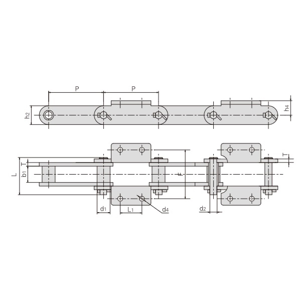 - Composta da perni, rulli, piastre interne della catena, piastre esterne della catena e piastre di collegamento a forma di “L”.