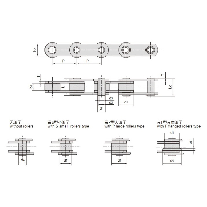 - Disponibile in versione senza rulli o con rulli piccoli di tipo S, rulli grandi di tipo P e rulli di spalla di tipo F per le diverse esigenze di trasmissione.