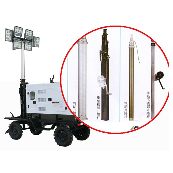 3. Sistema di sollevamento: La torre faro è dotata di un cilindro telescopico a 3 sezioni, che può coprire un raggio di illuminazione massimo di 35-55 metri quando viene sollevato. I cilindri sono controllati dalla pressione pneumatica e supportano il sollevamento e l’abbassamento elettrico o manuale, con protezione automatica della pressione dell’aria durante la discesa. Gli utenti possono anche scegliere di personalizzare il palo della luce telescopico a 4 sezioni.