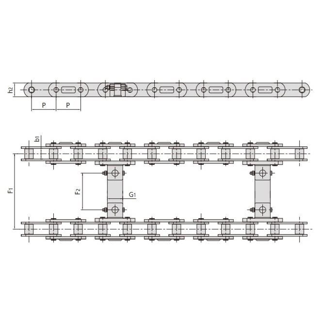 - Prima unità di catena interna:Due piastre di catena interne parallele con due serie di rulli per un movimento fluido.